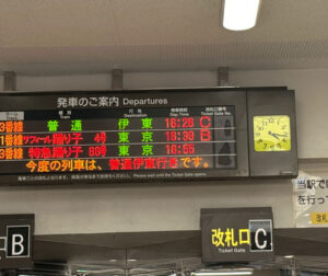 伊豆急下田駅で東京行きの特急の指定席の空きはゼロ、立って行くかと言われたのだが、先発の普通電車に乗ることを決意、16時26分発の伊豆急下田発の普通列車に乗れば、伊東駅で17時45分発の上野・東京ライン(宇都宮行き)に乗り継げるので、グリーン車で横浜まで帰ることができるからだ。